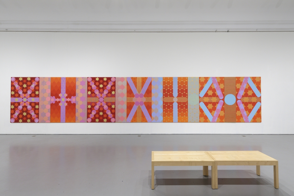 Det finns en visande gest inbakad i den finska målaren Mari Rantanens utställningar. Steget som fört en inom synhåll för hennes konst tycks också ha varit en signal för att ridån skulle gå upp. Det är otäckt på samma sätt som att komma in på en scen. Man ser allt på en gång och får likafullt ingen överblick, kanske för att man inte urskiljer samordningen mellan alla detaljer trots att de är tydligt återvgivna: ytorna täcks av mönster baserade på grundformer som delas och kombineras till nya former.