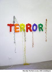 Slike opplevelser av vilkårlighet gir ufrivillig inntrykk av noe slapt og uengasjert. Man ser for seg autodidakten i Sartres Kvalmen i det han endelig når frem til bokstaven p_ og ord som begynner på _pop-, uten å ense at begrepet nettopp her er leksikalsk definert, forstått og utdebattert som del av modernismens vokabular for politisk analyse. Den tomme, litt kvalme følelsen som Sartre beskriver i sin bok oppstår også i møtet med Marc Bijls verk i utstillingen. Det er så riktig, passe ambivalent og antiiamerikansk at det virker nesten paralyserende på enhver refleksjon. Flagget med påskriften, de tomme pappeskene og den svartmalte ørnen fremstår fullstendig som tomme og forutsigbare utsagn. I ettertenksomhetens lys fremstår riktignok treenigheten av objekter som mulige ironiserende parafraseringer av 70-tallets kritiske og anti-amerikanske kunst. For dette er vel ikke alvorlig ment? Også andre verk kan virke uengasjerte og uforløste fordi kunstnerne så tydelig bestreber seg på å bli forstått som inneforstått. «Vi er ikke egentlig populister», står det skrevet med store bokstaver over verkene. Hvilket jo også er en form for populisme, dersom publikum forventes å dele den samme inneforståtthet.