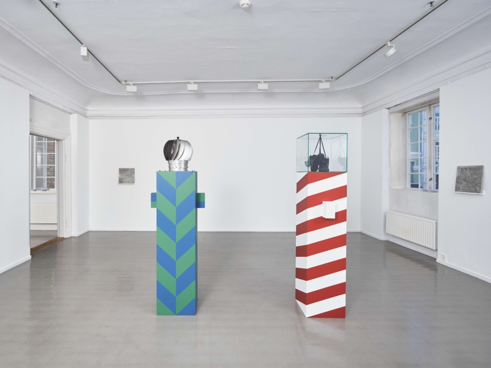 Enghs utstilling på Oslo Kunstforening har røtter i mer tradisjonsbunden praksis. Det går i pidestaller og emblemer ment for masseproduksjon av motiv. Visuelt er The Sign of Four en slank, stringent og vertikal greie. Pidestallene hermer hermer, en skulpturform fra antikkens Hellas hvor et hode (og innimellom en pikk (sic)) var plassert på en søyle for å markere eiendom og beskytte mot ondskap. Ikke så annerledes enn en tomtestein i skauen heromkring. Men litt festligere å se på. Disse står rundt i det skakke lokalet til kunstforeningen (som ligger i den eldste bevarte murbygningen i kvadraturen i Oslo) både som påstander og som gåter. Pidestallen er som grammatikk i et visningsrom, helt nødvendig og likevel usynlig når den er korrekt. Engh gjør pidestallen synlig.
