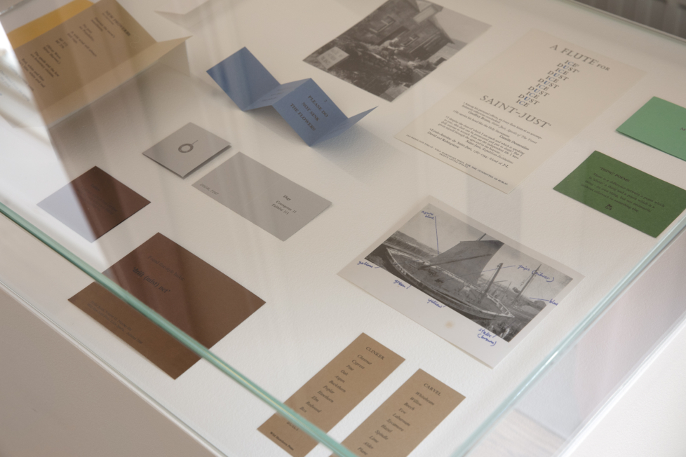 Presentationen tar i huvudsak fasta på Finlays mogna period på 1980- och 90-talen, och består uteslutande av verk på papper. Under mitt besök kunde jag inte låta bli att önska att man även hade inkluderat hans skulpturer, och att utställningen hade fått ta hela konsthallen och den intilliggande skulpturparken i anspråk. Ändå har det mindre formatet sina poänger, eftersom Finlays förkärlek för trycksaker gör det möjligt att distribuera och ställa ut hans arbeten även med begränsade resurser.