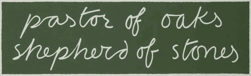 Två verkserier har placerats runt giljotinerna. För det första vad jag, och säkert många med mig, betraktar som några av Finlays finaste arbeten – poem som Pastor of oaks / shepherd of stones (1992), Blue water’s bark (1992) och Dove, dead in its snows (1989). Verken är utförda samarbete med kalligrafen Julie Farthing, och består av orden i sina titlar samtidigt som vatten-temat understryks av typografi och färgsättning. Här har de dessutom placerats längs en böljande horisontlinje. Kanske var den skotske «provokatörens» värsta brott hans otidsenliga skönhetsvurm?