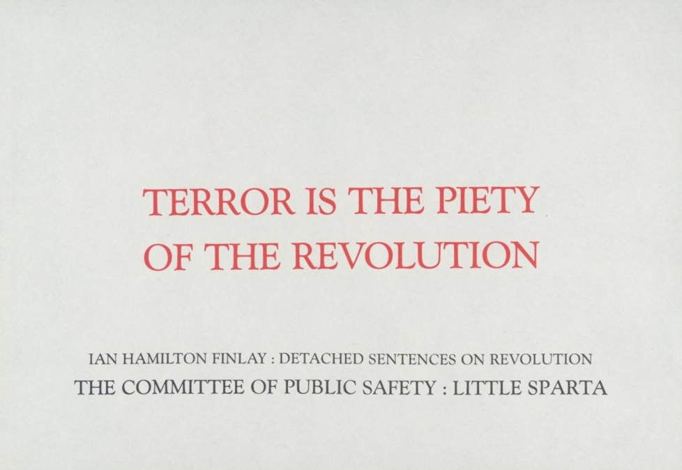 I rummet visas även den visuellt strama serien Detached Sentences on Revolution (1980), i vilken Finlay har låtit tryckt aforismer som «Terror is the piety / of the revolution» och «To be a hero / it is not enough / to write to bureaucracy twice» i röda serifer på vita sark. Verket anspelar på poeten och trädgårdsmästaren William Shenstone Unconnected Thoughts on Gardening (1764) som bland annat liknar en trädgård vid en «episk dikt».