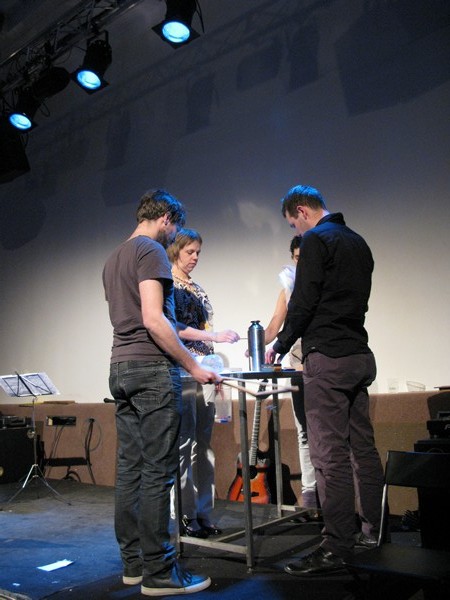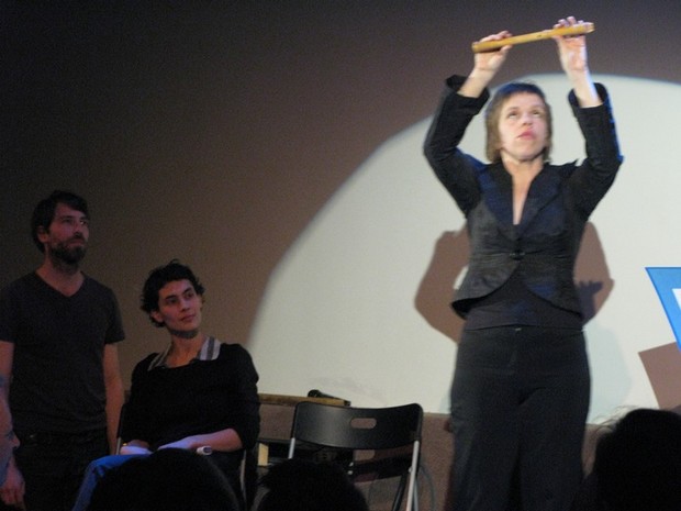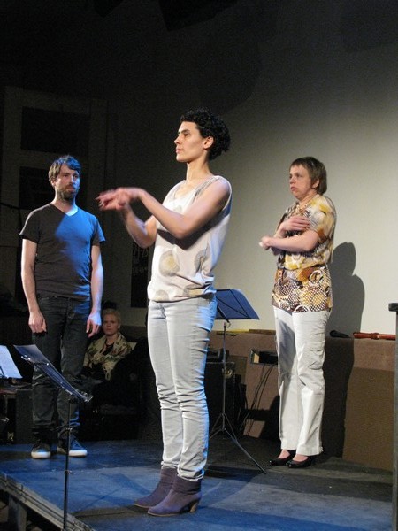 | Fra fremføringen av David Helbichs «Vorspiel for recorder player and 2 performers» |