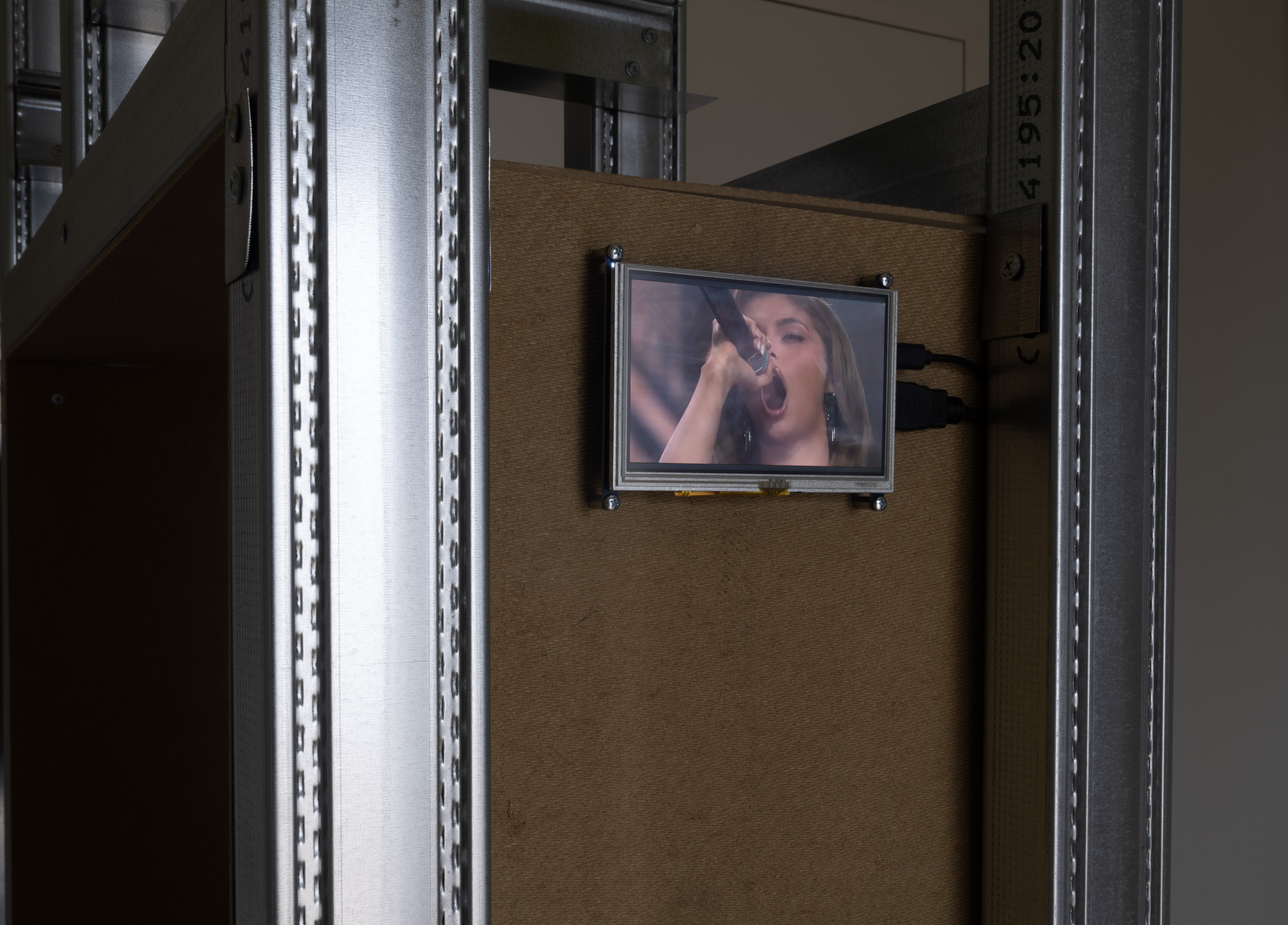 Samtidigt laddades rummet av något nytt och osäkrat. På golvet låg två stora transportlådor för instrument och ljudutrustning, Heavy Duty och Heavy Duty II (alla verk 2025). I båda har Haugerud skurit ut stora f-hål, som gör att lådorna framstår som mjukare, mer levande. I den ena låg också en hoprullad utskrift av en konversation med chatgpt där det bland annat går att läsa «There’s no single frequency that can make any group of people feel less lonely».