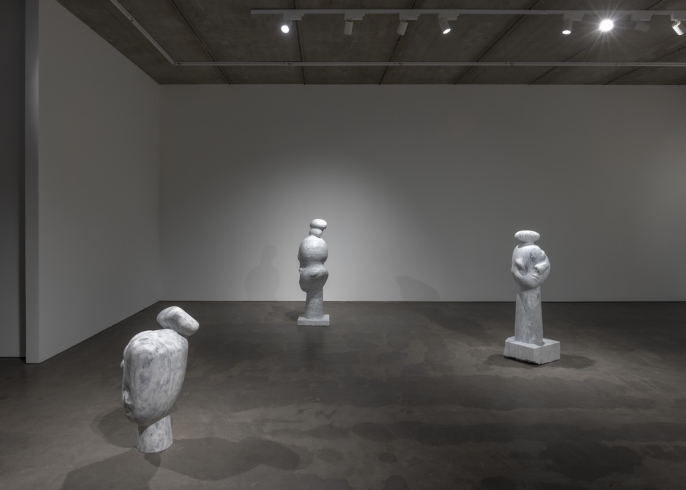 Mytologierne står altså forrest i Brandt Hansens soloudstilling, græsk i titlen, inuit i selve arbejdet. Allerede i galleriets foyerlignende indgangsparti skinner et gyldent kranie af besjælingsvilje og de tupilaktraditioner, som Brandt Hansens arbejde blandt andet er forankret i. Kunstneren er født i Nuuk i 1990, tog i 2022 afgang fra Det Kgl. Danske Kunstakademi og arbejdet har, står der på Andersen’s Contemporarys hjemmeside, rødder i hans grønlandske arv. Med guldkraniet som krog trækkes blikket ind i selve udstillingsrummet, hvor fire marmorskulpturer er hovedroller. Noget smeltet menneskelignende eller små søjler eller stenskyer ligner de, disse figurer, der er billeder på vejrgudinden Asiaq, som her er spaltet i fire verdenshjørner, fire marmorblokke.