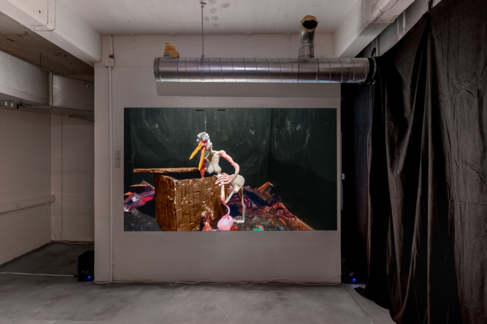 På Hudiksvallsgatan glider jag friktionsfritt mellan två utställningar med mestadels måleri hos Larsen/Warner och Coulisse. Därefter tar jag en industrihiss upp till helgens nypåhitt SHAME, en konstfilmfestival i regi av Hans Berg, Nathalie Djurberg och Silvana Lagos, som är minst sagt skavig, på alla de bästa sätten. Jag lotsas in i hissen av en säkerhetsvakt med en airpod istället för öronsnäcka i örat, upp till en enorm lokal om två våningar som i klassisk dark room-stil enkelt delats in i ett gäng mindre rum medelst stora svarta tygstycken.