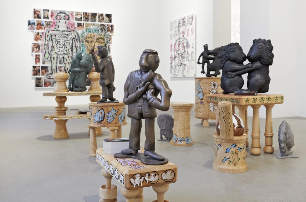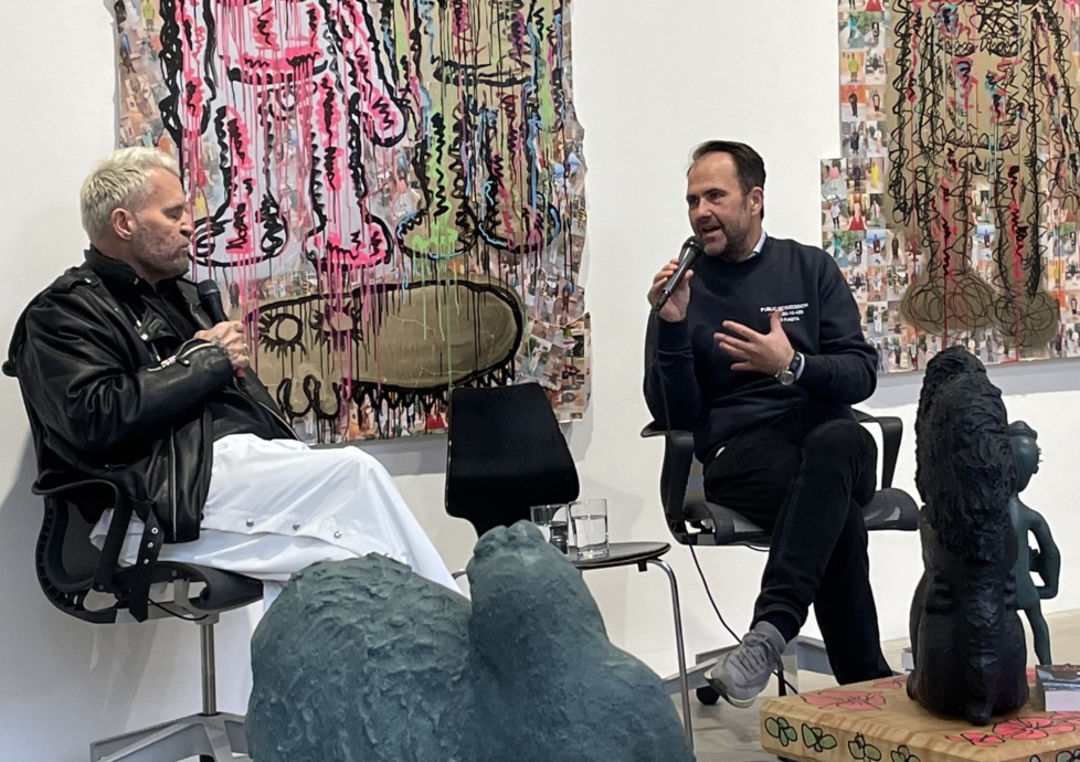 Helt av misstag råkar jag ta mig en trappa ner, där gallerier som Hammarén och Thomassen från Göteborg samt Ping-Pong och Thomas Wallner från Malmö gästspelar i vad som tydligen kallas GWS extended. Uppställt som en liten mässa, bland klappstolar, hittar jag Lars Olof Loelds (1930–2023) ståndkraftigt abstrakta linjemåleri sida vid sida med styvt resliga fallosar. Och så fortsätter det – inte minst, föga förvånande – i Anna Bohman Gallerys solouställning med teckningar, collage, måleri och nya skulpturer av den norska machomannen Bjarne Melgaard. Jag besöker utställningen under lördagen, för ett samtal mellan konstnären och kritikern och curatorn Erlend Hammer. Slutsats: mer risk, sex och skam i konsten, tack!