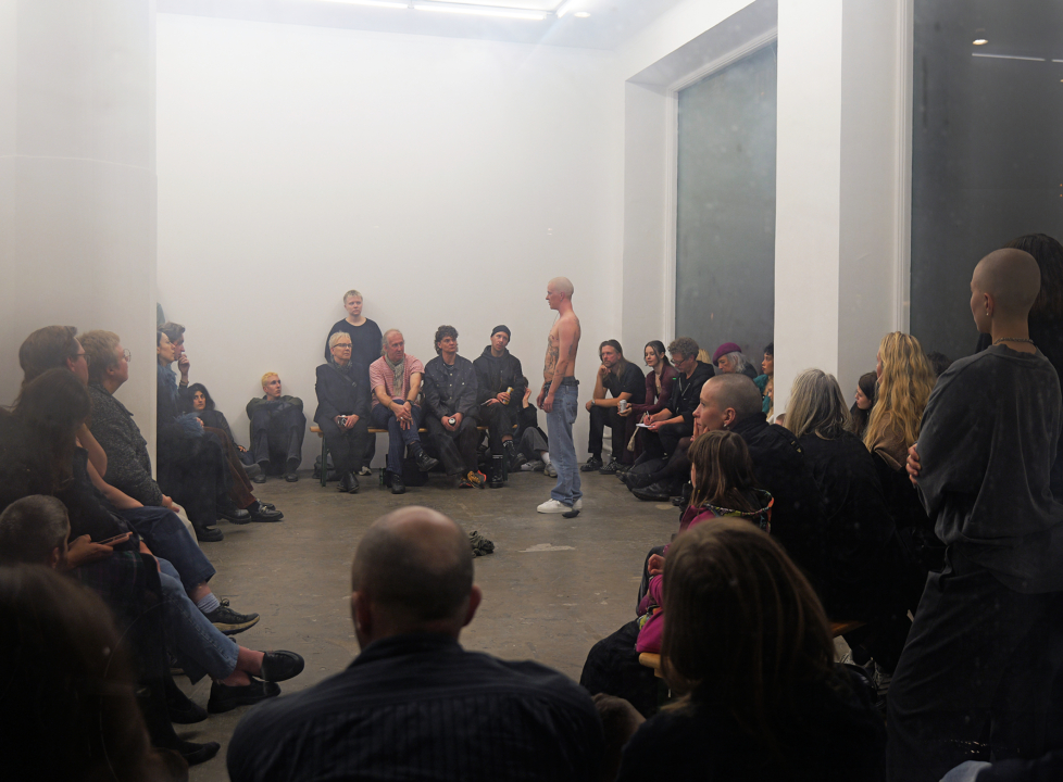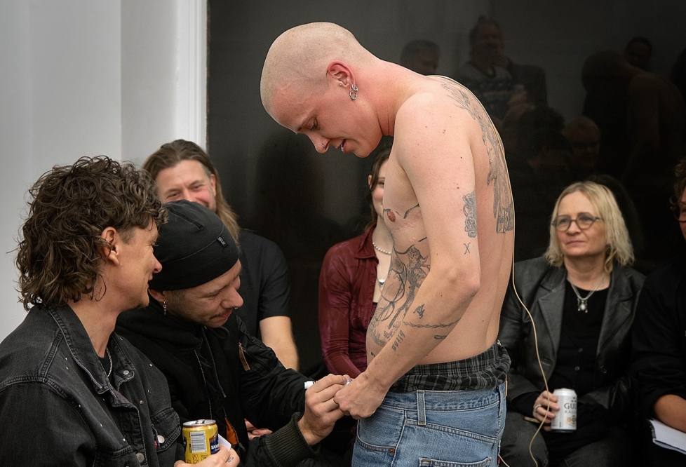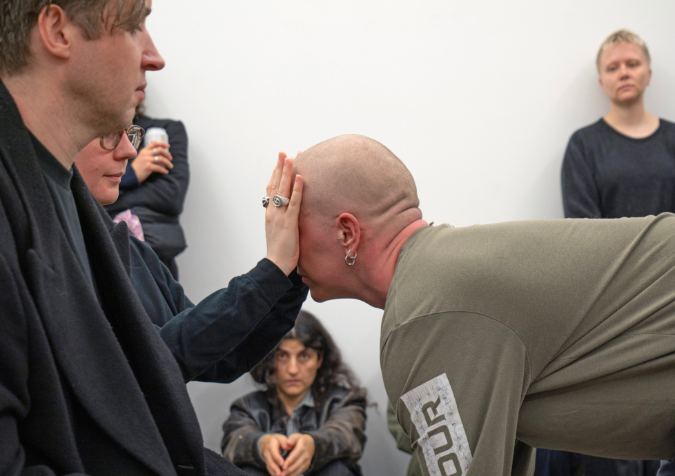 Allt detta aktualiseras på ett slående sätt i helgens avslutning: finske Teo Ala-Ruonas performance Anabolic Spectacle på Gallery Steinsland Berliner. Verket växer fram i ett svagt, trummande ljudlandskap där konstnären tar hjälp av publiken med att raka sitt huvud, en gest som pendlar mellan ritual, underkastelse och rening. Med viskningar som «would you help me, please» och citat hämtade ur rakapparatsrecensioner – «best trimmers for men, top rated by grooming experts» – blandas kroppens intimitet med konsumtionskulturens språk.