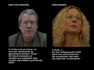 Det er forunderlig at Lilly Vinje ikke oppfatter det som et bevisst kunstnerisk grep fra min side at jeg lar alle disse 12 fornuftige menneskene ”snakke i munnen på hverandre”. Et minimum utgangspunkt for en kritikk må være at man ikke oppfatter kunstneren som uopplyst og ubevisst. At det er mulig å tilegne seg ytringene med en viss anstrengelse, er også et aktivt grep. Hva man evner å få ut av dette er betrakterens eget ansvar.