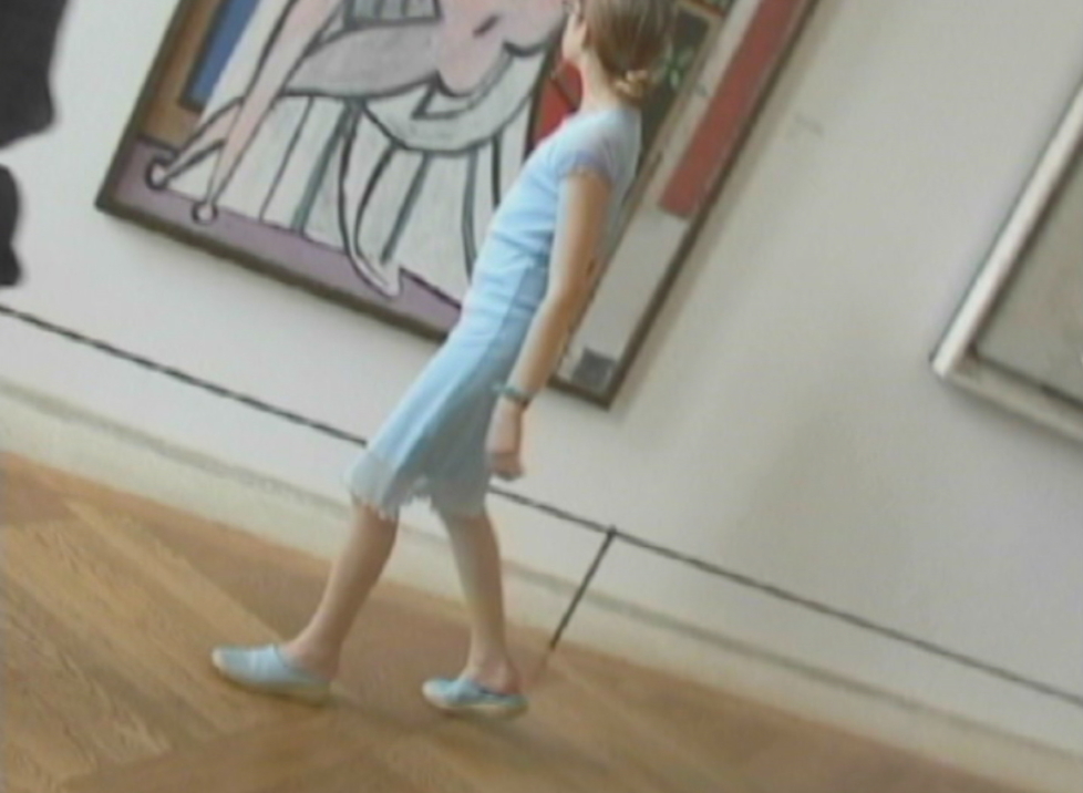 Good art often carries a touch of nonchalance: works seem to be casually dashed off by the artist in an effortless manner you just can’t fake. Bacher was that kind of artist. Often, the effect is created by her juggling something obvious and obscure all at once. Take, for example, the five-minute video Girl in a Blue Dress (2002), in which Bacher’s camera follows a girl, probably in the early stage of adolescence, wandering around the Musée Picasso in Paris. The camera rarely rises above her neck; we seldom see her face, only her pale blue summer dress and bare legs in matching shoes as she moves past the master’s paintings and other visitors. The footage is very obviously handheld, filming the floors, elbows, and rucksacks – perhaps it was filmed without consent? A strange mix of amateur footage, surveillance, and semi-transgression, though nothing really happens.