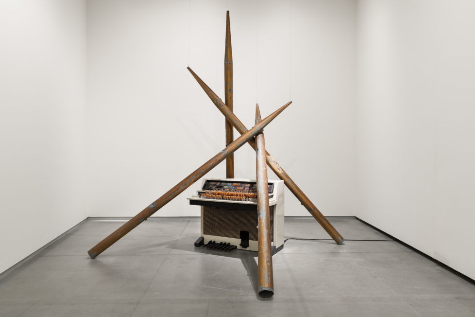 Other constellations of works are emotionally gripping in a different and almost intimate way, such as the room containing the black-and-white photograph of Bacher’s husband’s hands, Untitled (Mudra) (1975) as well as the utterly brilliant Yamaha (2010), made just after his death, an electric organ topped with oversized organ pipes that intermittently emit plaintive, trumpet-like sounds like elephants in mourning or a requiem that never quite gets past the opening notes.