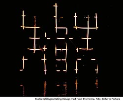 Calling Clavigo er bygget opp i tre deler. Først får vi lest opp en monolog om Goethes dannelsesforståelse. Vi blir introdusert til dannelsens univers gjennom å bli opplyst, altså dannet. Monologen avsluttes med at oppleseren tenner en sigarett på scenen, mao en utpreget udannet gest i den norske konteksten. Jeg velger å tro det er tilsiktet, men det kan vi ikke vite. Spennet mellom dannet opplesing av opplysende tekst og udannet røyking av filtersigaretter i offentligheten fungerte effektivt nok. I bakgrunnen ser vi abstrakte figurer bli til i et svart-hvitt rutenett, et bilde på det faste mønsteret som brytes i stadig nye overraskende konstellasjoner: dannelsen mellom konvensjonene og bruddet med dem. Jeg synes det virker lovende, både med tanke på dannelses-synet og formspråket som skal uttrykke det.