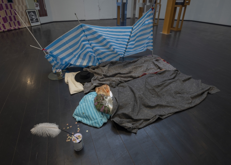 På den punkten tycker jag man lyckas ganska bra, även om iscensättningarna ibland blir för bokstavliga, som i rummet med skyskraporna, där låtsas-kakel-tapet känns som en tunnelbanefond för fyra hemlösa kroppar som gömts under olika filtar bakom wonky vindskydd. Den Frie är ingen vit kub där skulpturassemblagen kan sväva fritt i tomma intet, utan en träpaviljong från 1900-talet med svarta trägolv, paneler och rundkantiga, cirkustält-liknande rum som absorberas av gestalningarna. Det stör väl inte så värst – men visst skulle Genzkens busiga bricolage och skräphögar, om än så estetiskt precisa i sin komposition, gynnas av att tas ur verkligheten lite mer än de ges möjlighet till här.