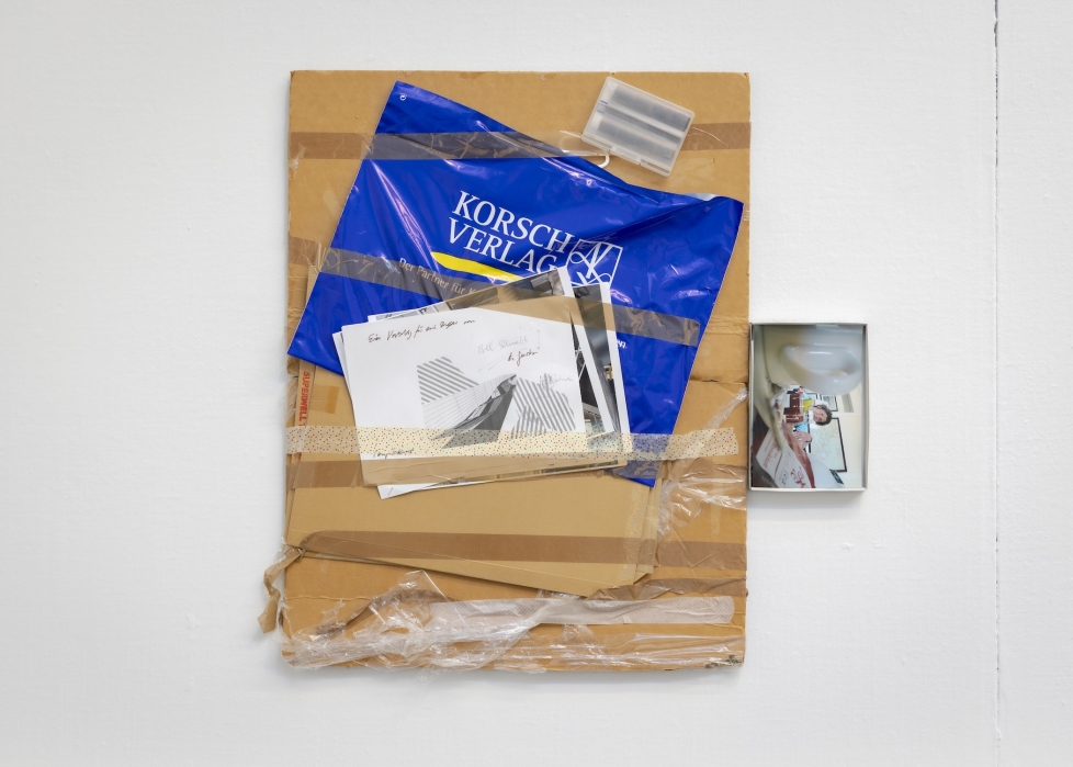 På motsatt vägg sitter fyra tavel-assemblage där kartong, folie, diabilder, fotoutskrifter, packplast, diskokulematerial, kläder och annat smått och gott tvingats ihop med tejp. I ett av verken har en bild av konstnären själv infogats i en låda som sticker ut på ena sidan. Bilden är tagen ur ett snävt, nästan klaustrofobiskt perspektiv, där konstnären framträder längst bak i bildrummet, medan förgrunden tätnar av objekt – tekoppar, papper, burkar – som fångad i ett seende där tingen alltid ligger i vägen för en övergripande förståelse. Som en skata verkar hon attraheras och distraheras av det som glittrar.