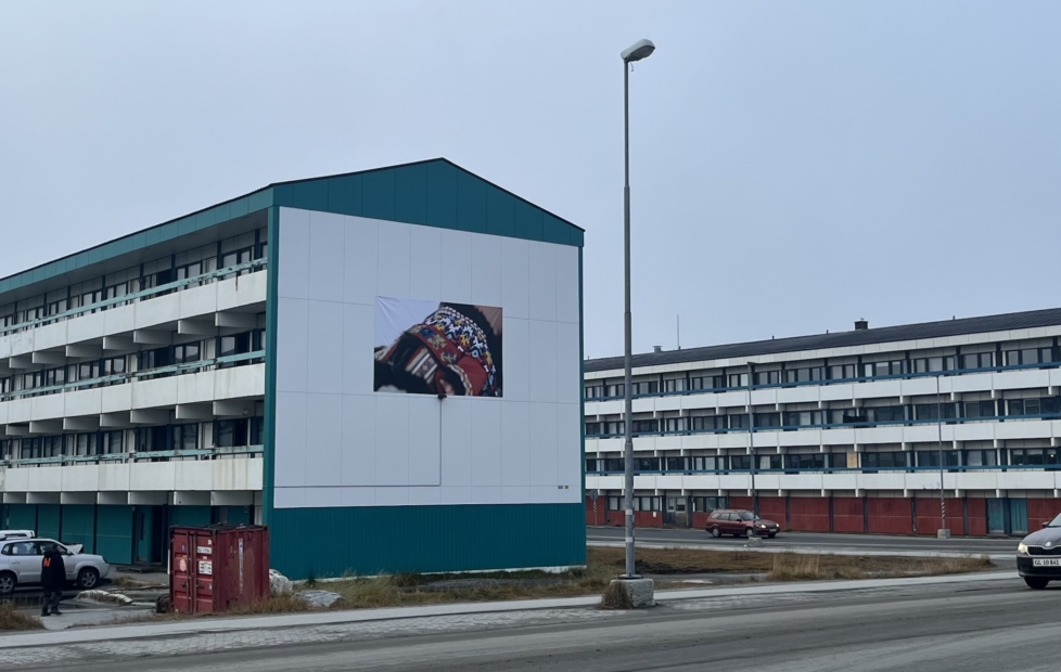 I anledning af festivalen er blokkenes store gavle udsmykket med bannere af Arnajaraq Støvlbæk og canadiske Julie Grenier, der begge har fotograferet smykker, perler og den slags småting, man finder i skufferne hos afdøde slægtninge. Der sker noget sjovt, når det fotografiske medie kommer ind imellem os og perlerne. Hvad mon det betyder for kommende generationer, når vi i dag digitaliserer vores minder frem for at gemme dem i skuffen?