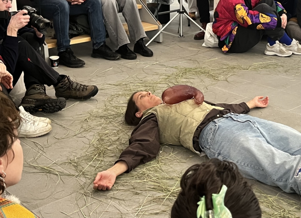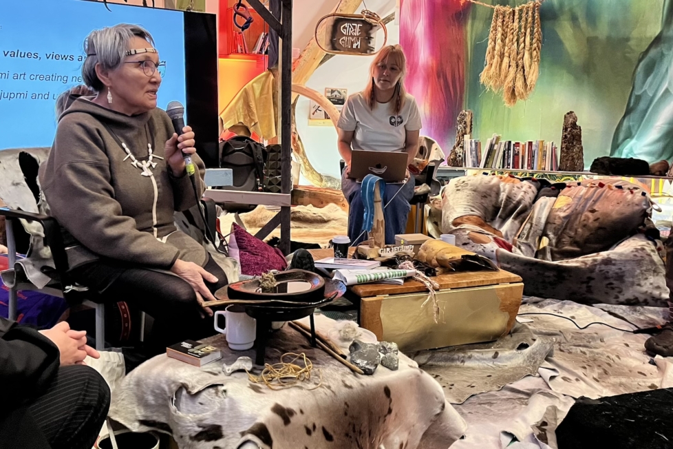 I løbet af festvalen glider den tilgang til materialitet og ritual langsomt ind i mig. I en meget rørende performance på kunstmuseet inviterede Máret Ánne Sara en gruppe scenekunstnere til at interagerer med hendes værker. To dansere undersøgte gennem bevægelser og åndedræt materialer som sennagræs og rensdyrmaver og det føltes som om deres kroppe gik i ét med det organiske materiale i en dans, der lignede en kombination af ballet og trommedans. Og jeg ved ikke, om det er den store mængde fællesskab og bløde rensdyrskind, der langsomt fordriver min europæiske kynisme, men jeg tager mig selv i at blinke en tåre væk, da lørdagens talkprogram åbner med tændingen af den traditionelle tranlampe qulleq til tonerne af en samisk joik.