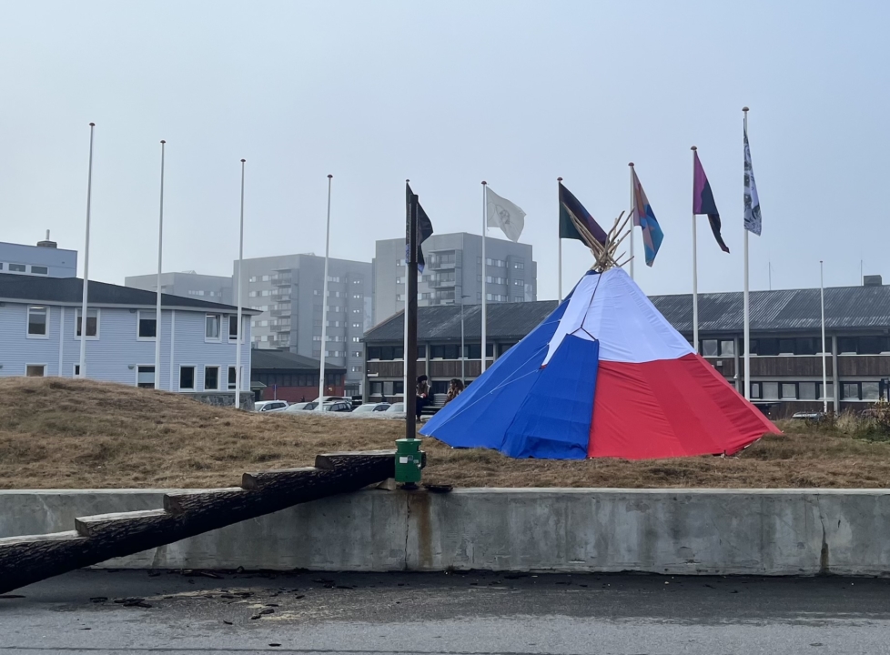 Jeg går langs hovedvejen, der skærer sig gennem fjeldet, og ned til Nuuk Kunstmuseum, som har til huse i en tidligere kirke, et grønmalet træhus med spir. Op ad facaden langs et højt vindue snor sig en række rensdyrgevir, et værk af den samiske superstjerne Máret Ánne Sara, som for tiden indtager Turbine Hall på Tate Modern, London. For det utrænede øje ligner det trofæer af den slags, man ville forvente at finde over kaminen i en jagthytte, men den, som ved noget om rener, ser eftersigende, at disse har levet et godt liv. Ved meget renopdræt skærer man nemlig gevirerne af dyret før slagtning, og at gevirerne fortsat sidder fast på hovedskallen vidner om, at dyrene stammer fra en samisk flok.