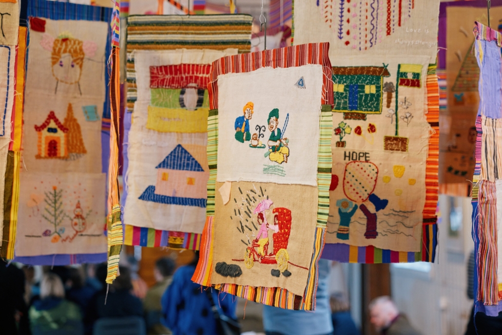 En mangfoldig forsamling aktører og aktiviteter er satt i sving, stort sett hver for seg, ved en rekke visningssteder og prosjektlokaler i og utenfor Bergen sentrum. Lengst borte er Tekstilindustrimuseet i nedlagte Salhus Tricotagefabrik, som befinner seg en times reise nordover langs kysten med Litteraturbåten Epos, en gammel bokbåt nylig konvertert til flytende kulturhus, med et eget turnéprogram under triennalen. På museet vises den thailandske tekstilkunstneren Jakkai Siributrs sosiale kunstprosjekt There’s no place (2020 – pågående). Fra taket henger en mengde fargerike lappetepper, håndbroderte med illustrasjoner og påskrift på ulike språk, som belyser kolonial og nasjonalstatlig vold påført urfolksgrupper. Under tekstilene satt en gruppe utfluktdeltakere som hadde løst billett for å medvirke i broderiprosjektet. Det var vanskelig å få sett ordentlig på bannerne, ettersom vi i resten av følget raskt ble loset forbi. I stedet fikk vi en (tilsynelatende improvisert) omvisning gjennom museets produksjonssaler. Det var en merkelig seanse, og jeg kjente at jeg gjerne skulle vært annensteds. For det krever stamina å få et overblikk over delene som utgjør helheten, og da gjelder det å være på riktig sted til riktig tid, og med riktig innstilling.