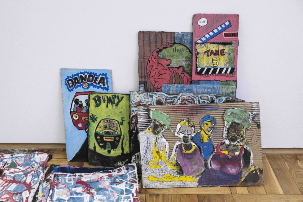 At the artist-run gallery Entrée, the Kenyan collective Maasai Mbili presents a sprawling array of unframed prints and works on paper. Pinned directly to the walls or stacked in piles along the floor and on the windowsill, the presentation of the works appears informal, bringing to mind a Christmas market where visitors are free to leaf through objects and rearrange them. Founded in 2001 in Kibera, Africa’s largest slum on the outskirts of Nairobi, the collective today consists of eleven artists. Their motifs are wide-ranging, spanning from figurative studies of humans and predators through to abstract and meme-like imagery, as well as stylised signage for small businesses. A series of five watercolours, each a variation on the same composition, stands out (Joachim Kwaru, all works untitled). In each, the upper panel depicts white garments hanging from a red washing line against a black background. Beneath single garments, black legs and lower bodies hover in front of a dense cluster of buildings. The simultaneously hopeful and melancholic atmosphere underscores the precarious living and production conditions of the slum.