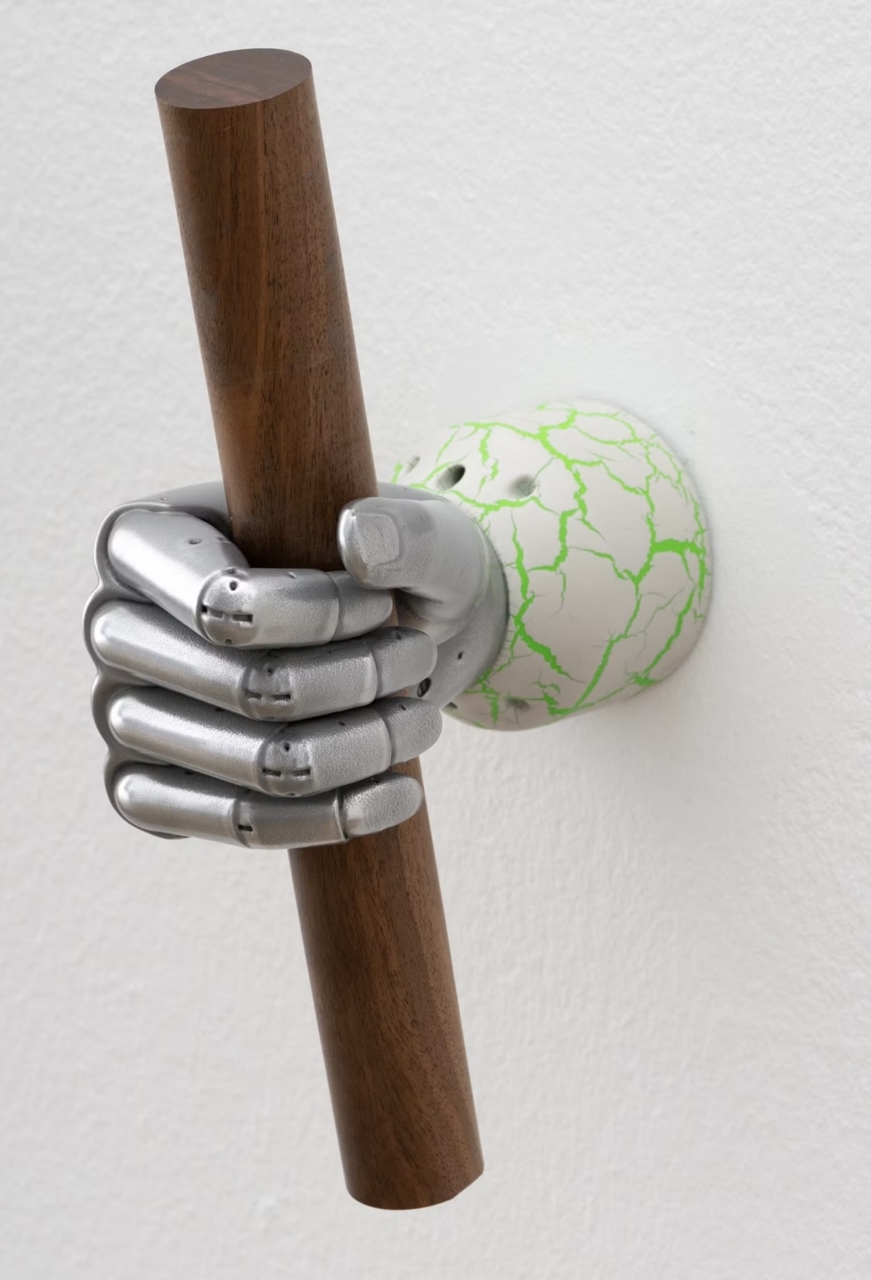 Apropos uncanny. Flere af udstillingens vægge er monteret med udgaver af den såkaldte Beograd-hånd – en jugoslavisk robotprotese fra 1960’erne, og den første mekaniske hånd, der kunne føle. Protesen bliver hos Domanović et symbol på en teknologisk utopi, der altid var lidt forud for sin tid, og derfor dømt til at mislykkes. I et andet værk glider fortællingen over i landbrugssektoren, med kølige fotos af unge kalve, født uden horn, avlet med den avancerede CRISPR-teknologi til avlsoptimering og profit. En slags science fiction forklædt som reportage om et system, der forsøger at hele sig selv med de samme teknologier, der fik det til at kollapse. Der opstår en sær resonans mellem den mekaniske hånd og de hornløse dyr – begge forsøg på at kontrollere naturen, begge skabt i fremskridtets navn og begge på kanten af det groteske. Domanović lader dem spejle hinanden som to tragiske løfter: et om menneskelighed, et om effektivitet.