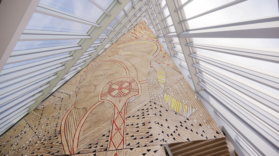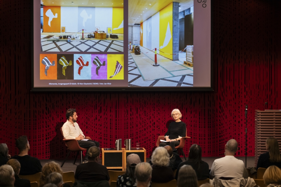 Nerdrum fortalte deretter om den åpne prekvalifiseringen KORO initierte i juni 2024 for kunst til de ulike departementenes inngangspartier. På bakgrunn av en skissekonkurranse ble fire kunstnere valgt ut, blant annet Mari Slaattelid, som møtte Snyder på scenen til en samtale om den tretten meter lange frisen hun er i ferd med å male opp direkte på veggen. Slaattelid snakket om hvordan det er å kle seg i gul vest og vernehjelm, og være en del av dem som reiser bygget, samtidig som hun kan bli bedt om å besvare utfordrende, «dypt eksistensielle» spørsmål på direkten – som hva meningen med arbeidet hennes er. Hun beskrev også prosessen in situ som nervepirrende, ettersom hun forsøker å male så tynt som mulig for at betongens kvaliteter skal skinne gjennom, og ikke kan male over og begynne på nytt.