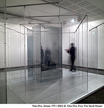 Et labyrintisk glassbur, (Amaze) hvor det advares mot klaustrofobi, opphøyd, som en scene, og før inntreden må man ta av seg skoene, med sine lyse omgivelser gjør det vanskelig å se hvor glasset slutter og hvor det begynner; den ene som jeg beskuet, en asiat, brukte hendene, uforskammet frimodig, som om hun var vant til trange rom, det hemmelig aller innerst ble synlig da jeg så at hun bøyde seg fram og lettet på et lokk og ved å se etter, på utsiden fra en annen vinkel så jeg det og dets aller innerste privatim ble synlig trivielt og brodden tatt ut eller omgjort til en munter hilsen: Et klosett.