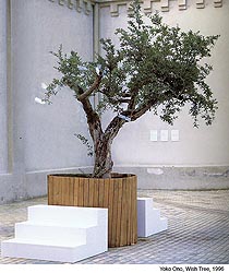 En prydbusk, med kraftig tvinnet stamme, bærer tittelen «Wish Tree», inntil er det plassert et bord, av en eller annen grunn fikk jeg det for meg at det kunne ha vært et nattbord, og den siste funderingen før søvnen kom, om den da kom, hvis den ikke kommer etter en stund, forsinket på grunn av alle de tankene som ikke vil bero til den neste dagen, om hva, om den barokke protestantismen og zenbuddhismen, som en viss type av likhet og en tydelig ulikhet, eller det som går hver sin vei; hennes latiniserte navn og hennes navns utseende vertikalt, som kanskje er noe av hennes doble hukommelse, nå vel på dette innbilte nattbordet var det lagt fram penner, nei blyanter, og flere lapper, perforerte med hvit hyssing, for å bli påskrevet ønskene og deretter oppdinglet på greinene til «Ønsketreet».
